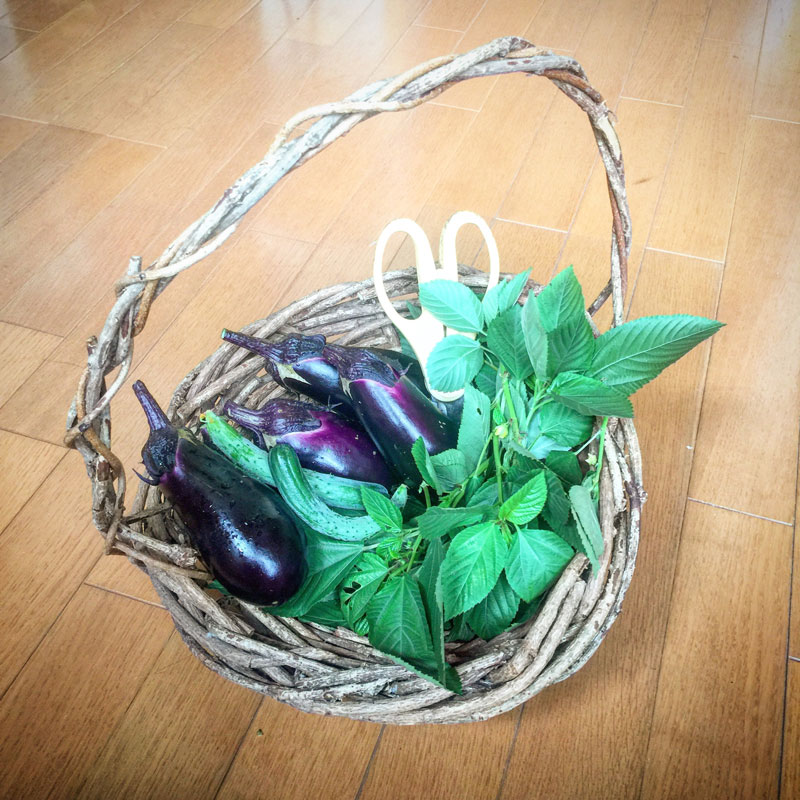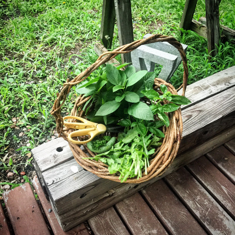 今宵の夕食に、庭の猫の額畑から葉物収穫。ルッコラ、モロヘイヤ、バジル、パセリ、とキュウリ。