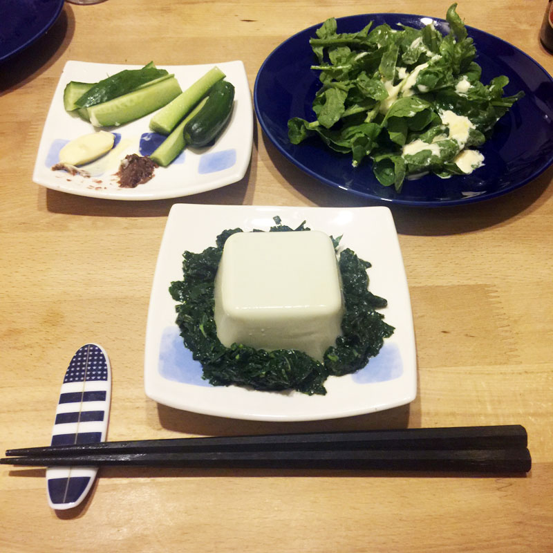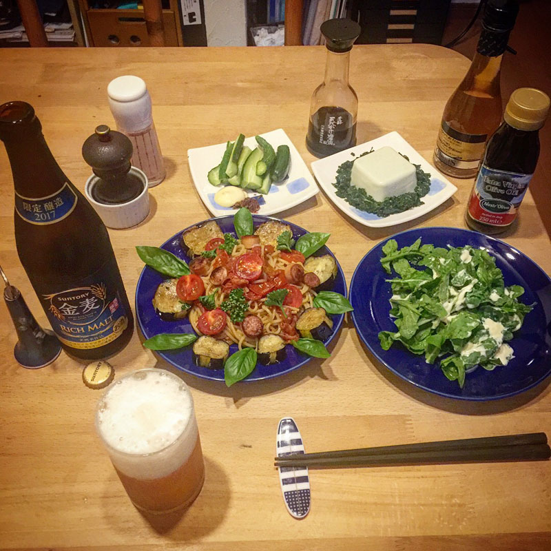 友だちのお百姓さんにいただいた完熟ミニトマトで作ったトマトソースのパスタ、ミニトマトとソーセージと庭の猫の額畑のバジルと揚げナスとパセリ添え。畑の梅マヨキュウリ、ルッコラのサラダ、枝豆豆腐のモロヘイヤ添え。