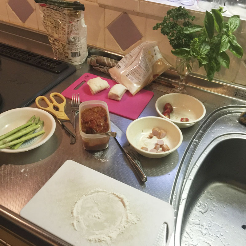 冷凍してあったピザ生地と完熟ミニトマトのトマトソースと畑のバジルでマルゲリータ。
