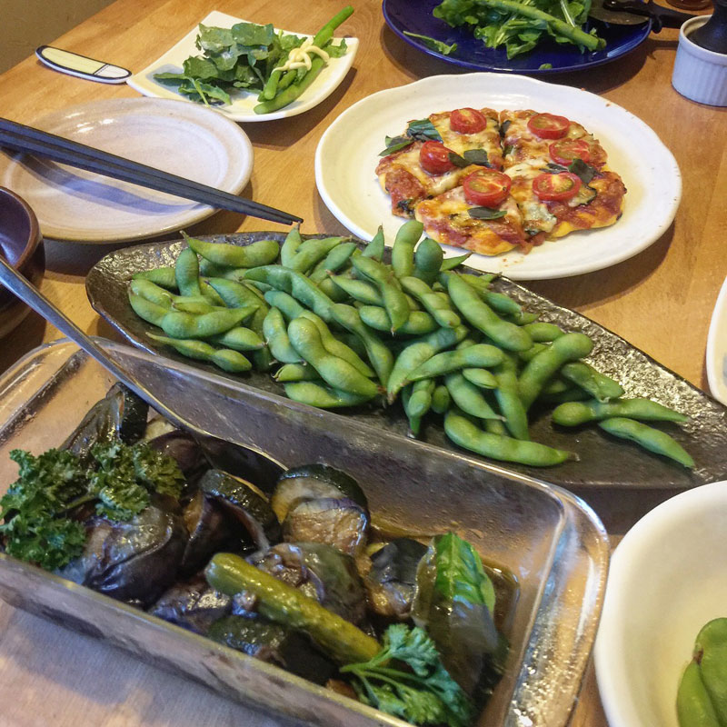 仙台茶豆、朝、作った茄子とズッキーニのバルサミコ酢和え、ルッコラのサラダ。