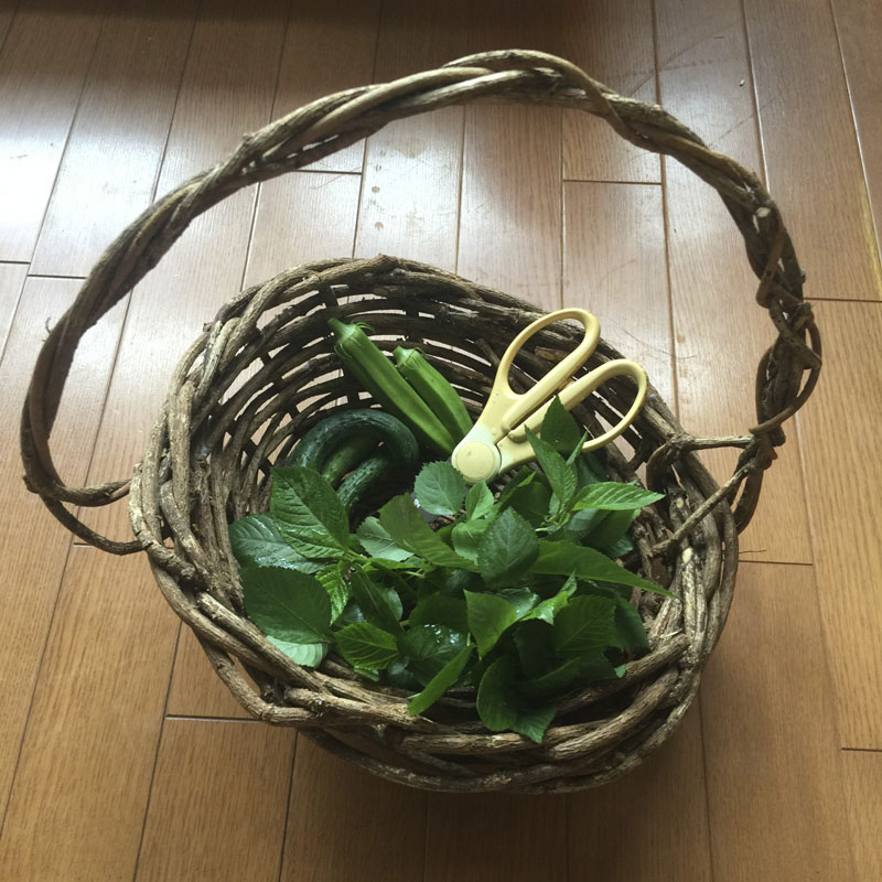 庭の猫の額畑から、モロヘイヤ、キュウリ、オクラ、ピーマン、茄子を収穫。