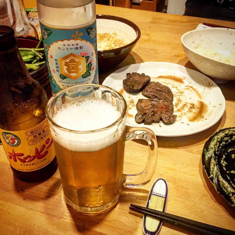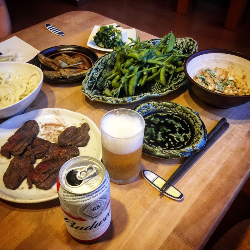 居酒屋我家、開店。恩人の棟梁の奥様にいただいたバドワイザーと牛タン。辰巳芳子さんのレシピのキュウリの胡麻和え。モロヘイヤとオクラの冷奴。枝で茹でた枝豆。野菜はどれも庭の猫の額畑から。