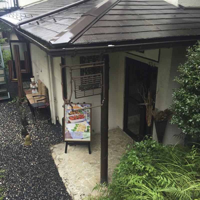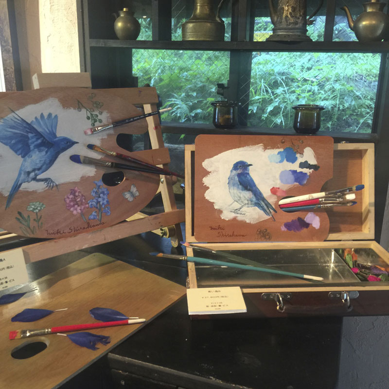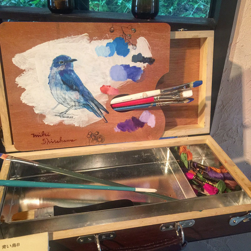 カフェの入口で迎えてくれるのはパレットに描かれた青い鳥。