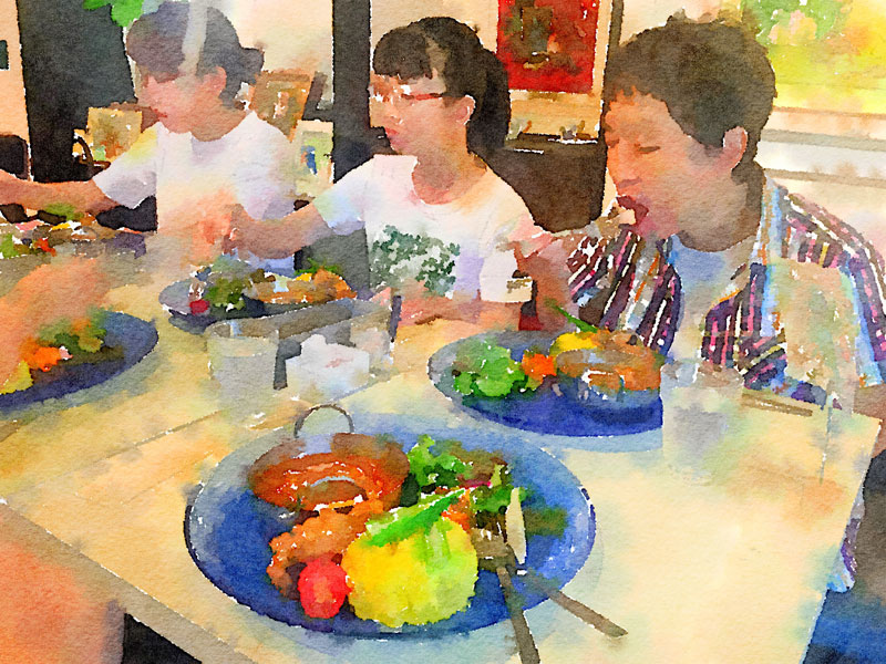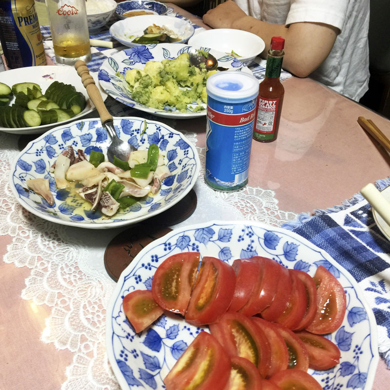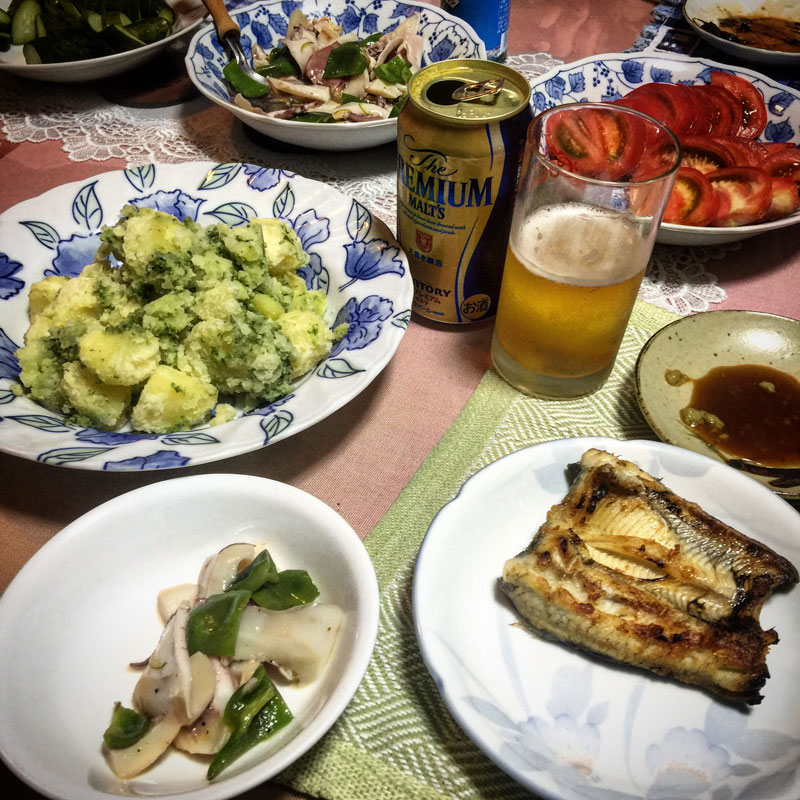両親の友だちが釣った鰻の白焼きなどの母親の料理に、摘んできたバジルのジェノベーゼポテトも。