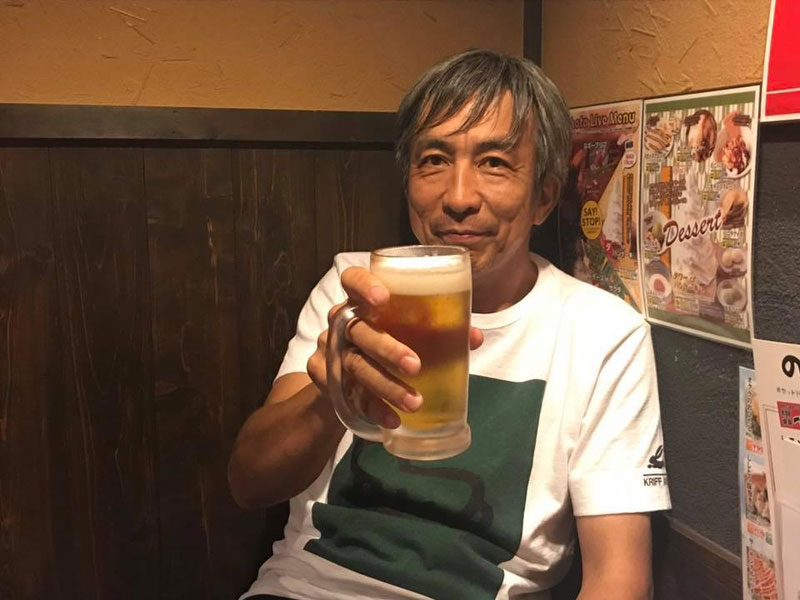 原くんが撮ってくれた居酒屋我家、以外の外の居酒屋でビールを飲む俺。居酒屋我家、以外で酒が飲めるなんて1年に数回あるかないか。