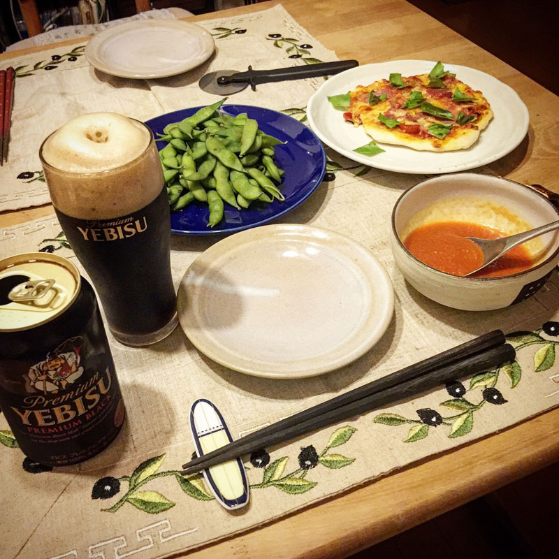 炎天下で一日働いた日に幸せな居酒屋我家、開店。ピザと枝豆と、暑い日に飲もうと思っているうちに9月になってしまった西原くんにいただいた黒エビス。美味い、幸せ。