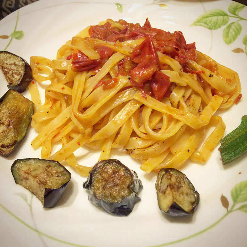讃岐パスタとミニトマトのソース。