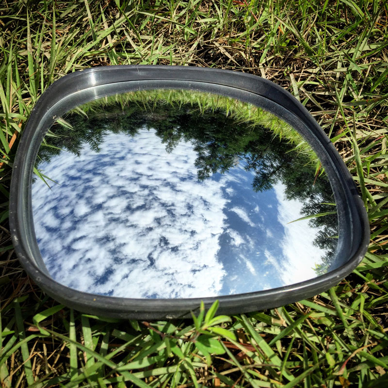 あんまりうろこ雲がすごいので鏡を使ってちょっと遊ぶ。この鏡は友だちの車「ホーミー」のサイドミラー。昔々、廃車になった後、仕事場の休憩スペースとして使わせてもらっていた。記念にミラーだけ大事にとってある。
