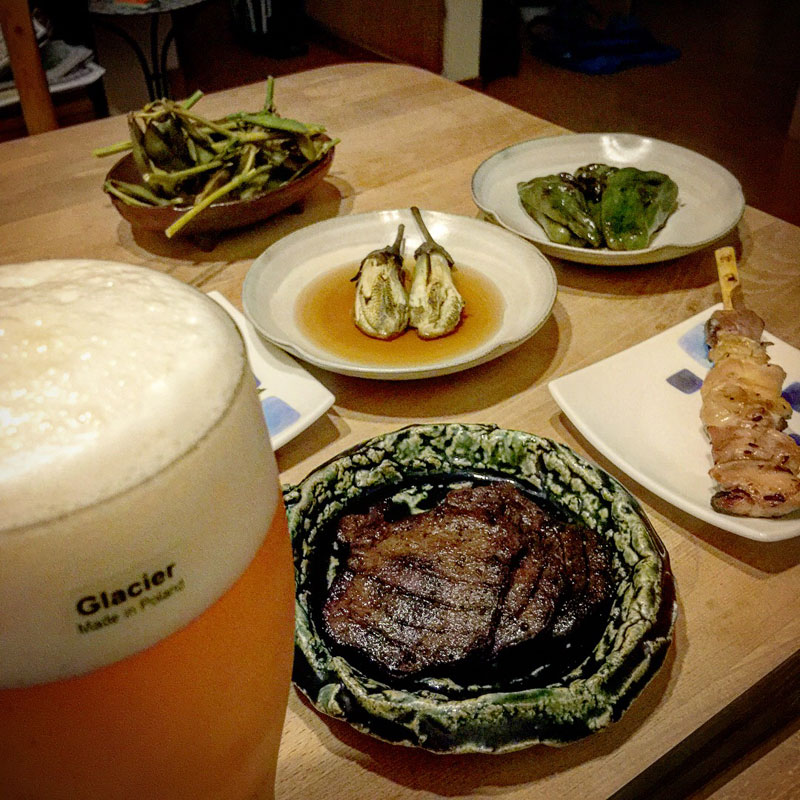 セブンイレブンの炭焼き焼き鳥一本。牛タン。ピーマン、茶豆。