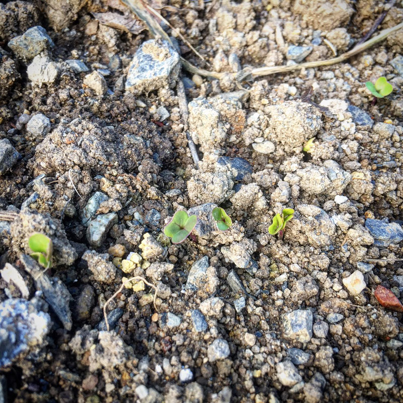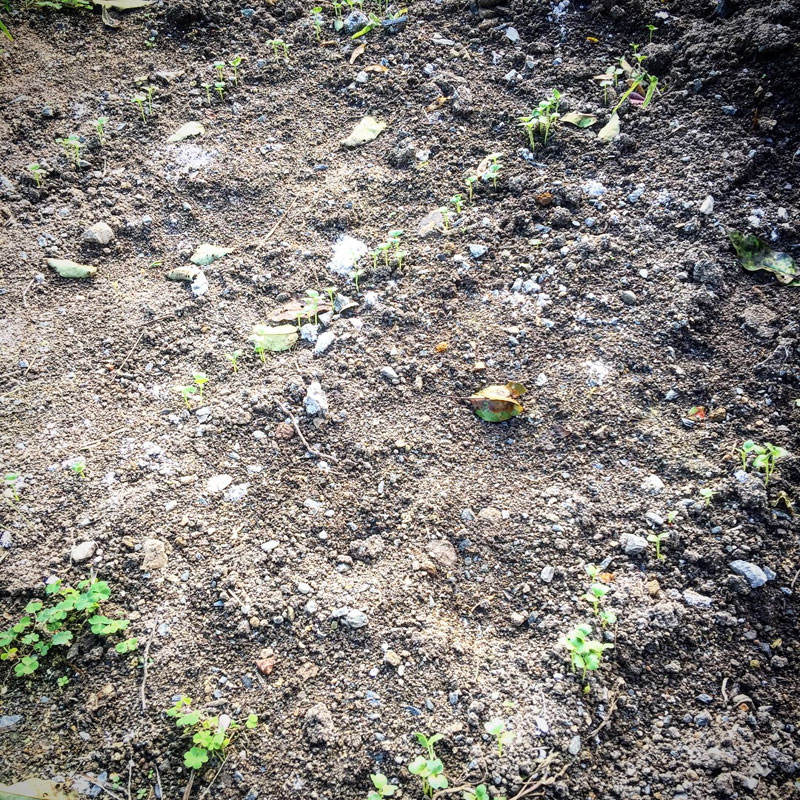 大根の発芽。間引きながら食べようと一袋全部撒いてしまった。とっておいてもしょうがないから。#庭の猫の額畑