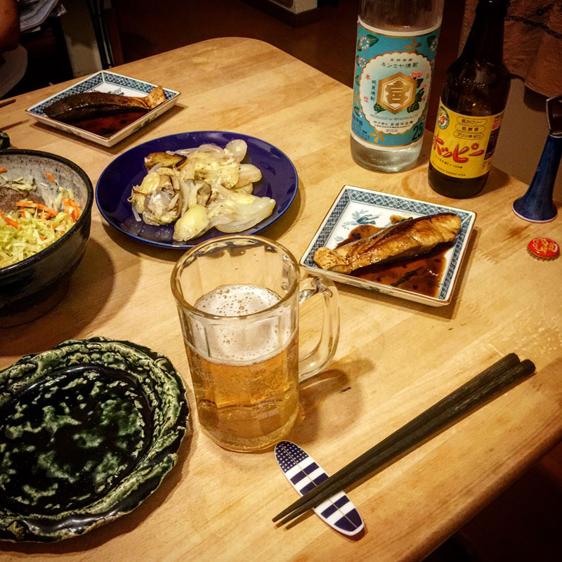 居酒屋我家、開店。ブリの照り焼き、スペインの赤ワインたっぷりの家庭料理、酔っ払いのじゃがいも。僕は暑い暑い日だけホッピーか美味しい。だから飲むのは夏だけ。夏が無かった今年、今日のホッピーは沁みる。やっと美味しい。