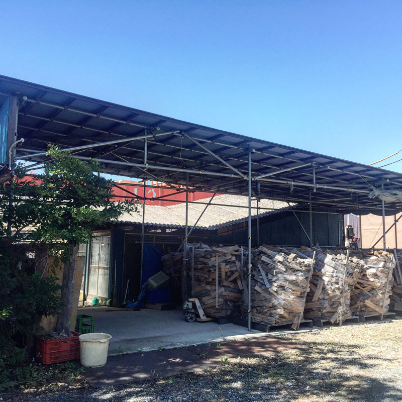 陶芸の窯。燃やすための木材が大量に置かれている。