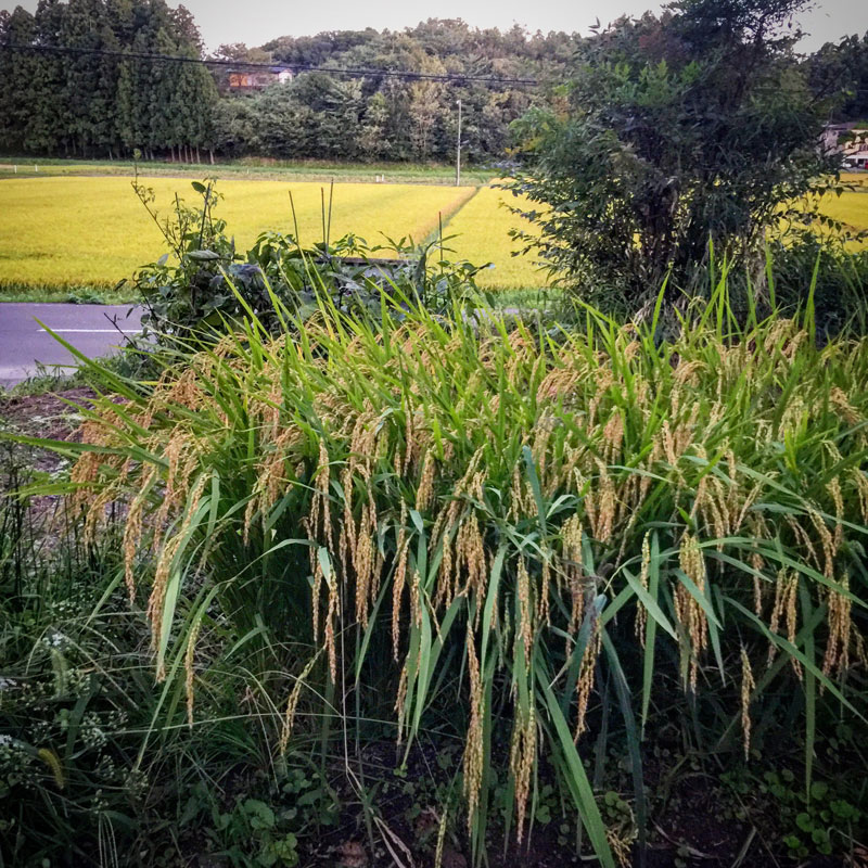 ただいま。台風の間、不在だった庭の田んぼ。無事。陽射しを除ける大きなシェードが地面に落ちてました。