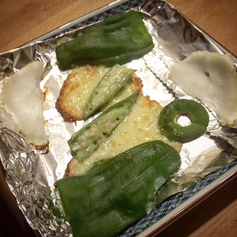 三田農園のさえ子さんのレシピで半分に切ったオクラにとろけるチーズを乗せて。