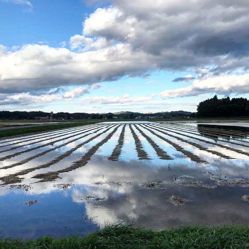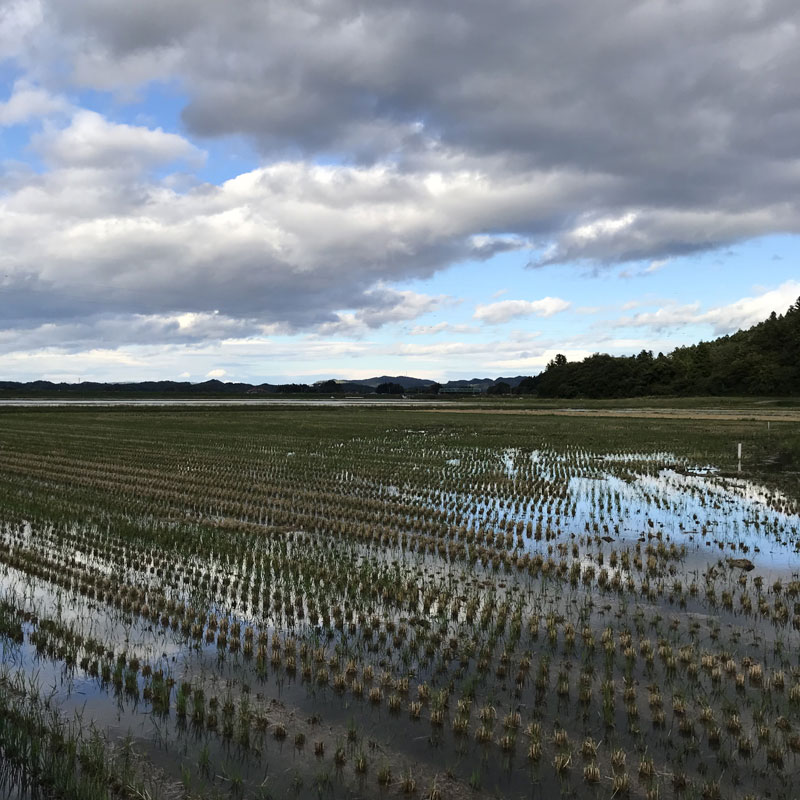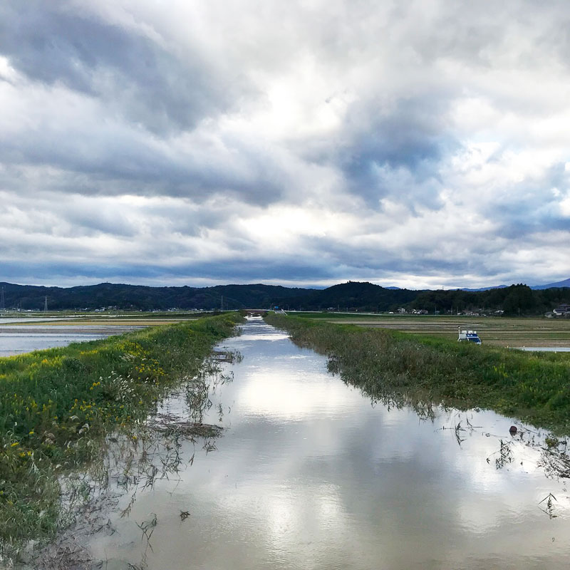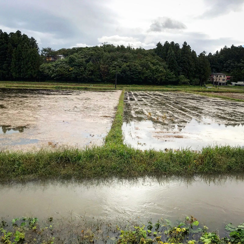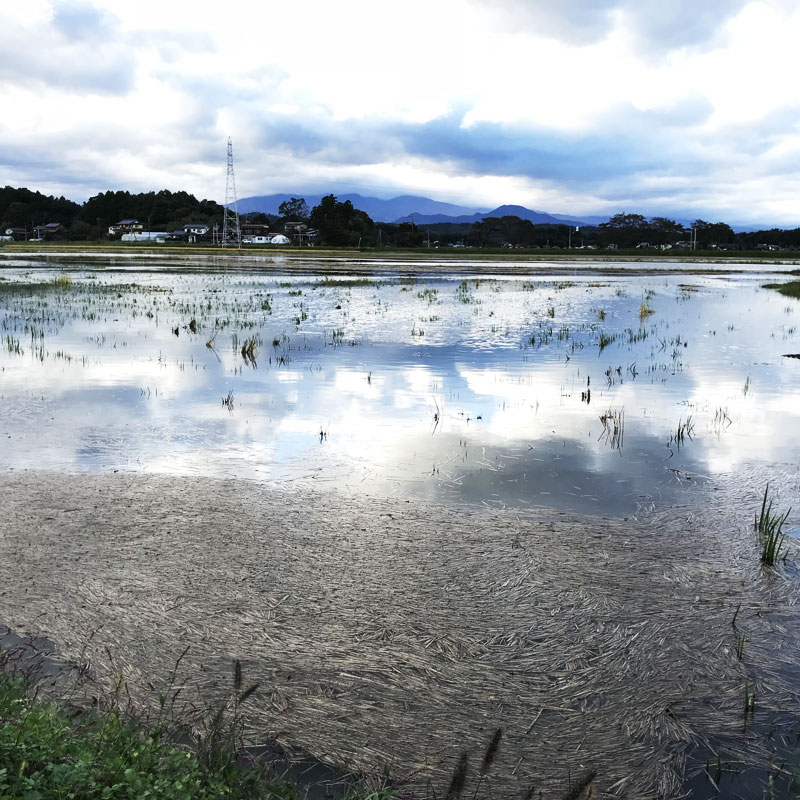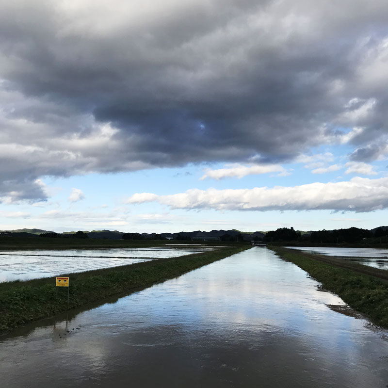 台風一過。早朝大雨の音で目が覚めたけど、その後雨は上がって時折日が差すほどに。これは家の前の田んぼ。
