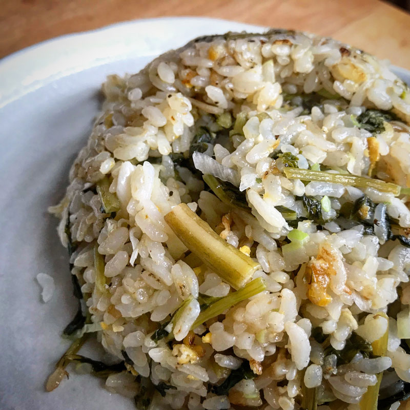 i畑から間引いた大根葉の炒めをたくさん混ぜて、昼に大根葉炒飯、作った。