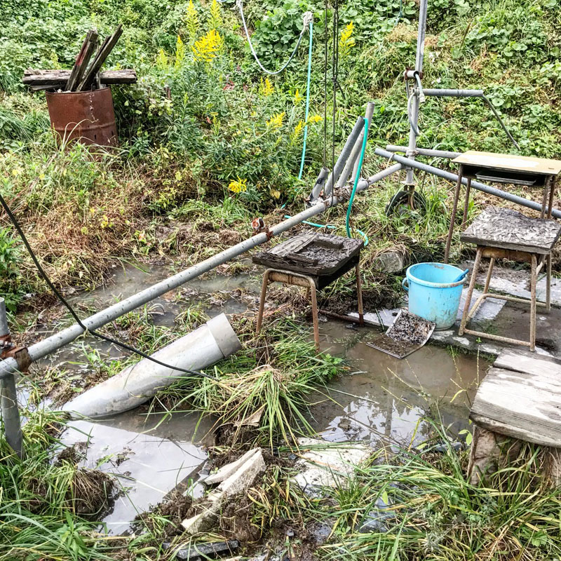 台風一過の仕事場。仕事が忙しくてなかなか来られなかった。大風で外れたテントのシートを貼り直した。