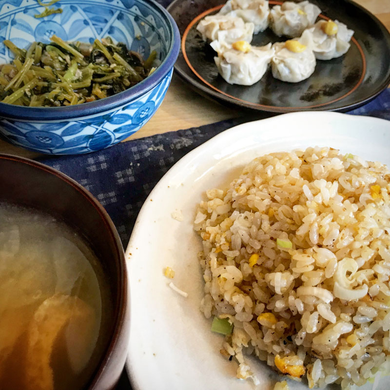 また炒飯作った。個人的に炒飯が美味しい東北194号という品種の新米で。それと、シウマイ、畑から間引いた大根葉の炒め、味噌汁。