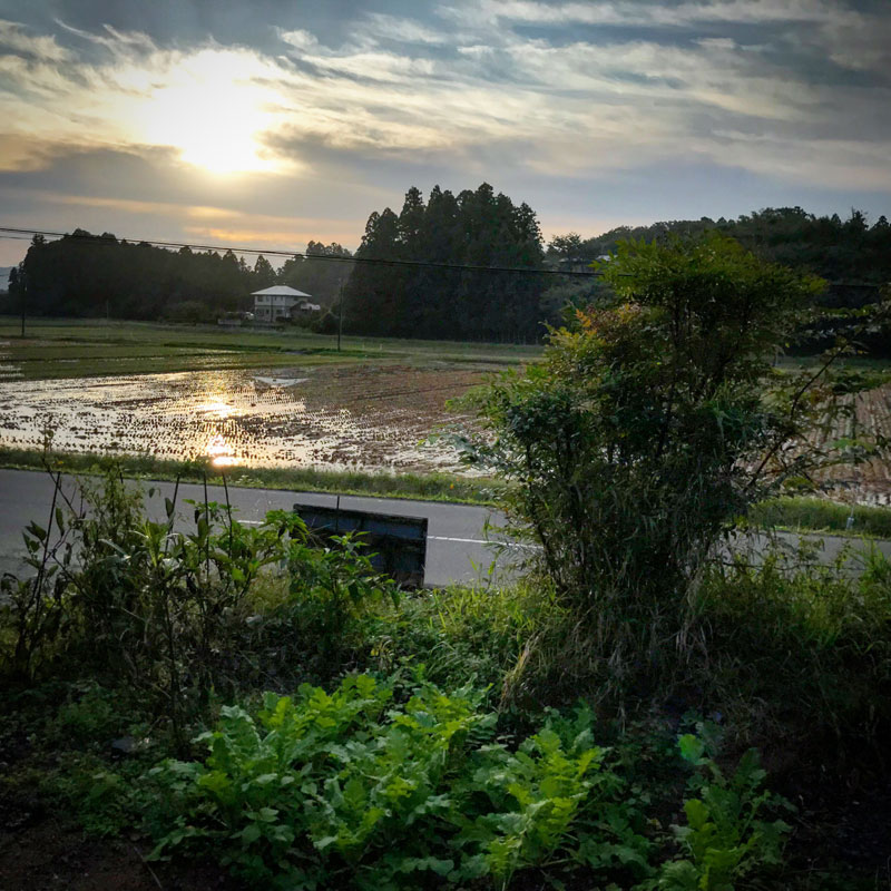 庭の猫の額畑と、台風の大雨が残る田んぼ。