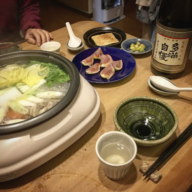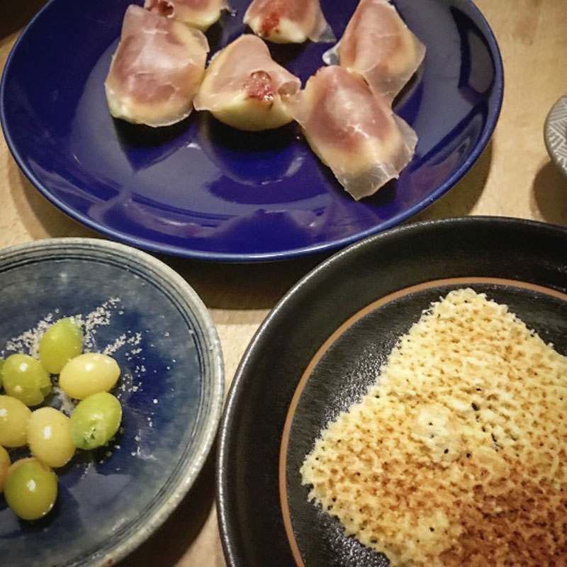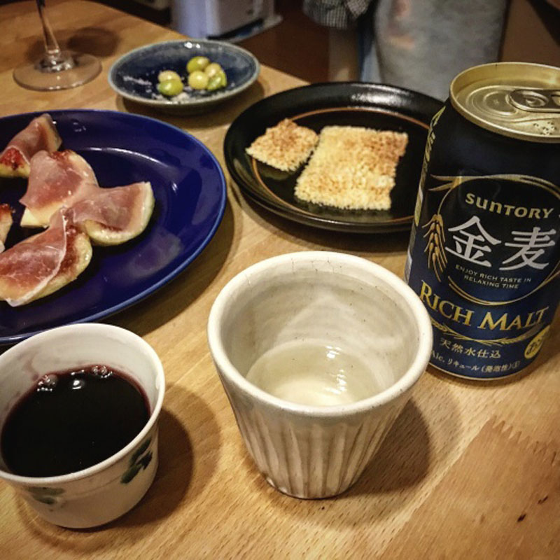 イチジクの生ハム乗せは ミュゼ・マエナカ、万里子さんの器でワイン、銀杏は元窯さんの皿に盛ってエミシ工房さんの白い器で日本酒、スライスチーズをチンしただけのカリカリチーズせんべいは金麦で。ちゃんぽんまっしぐら!