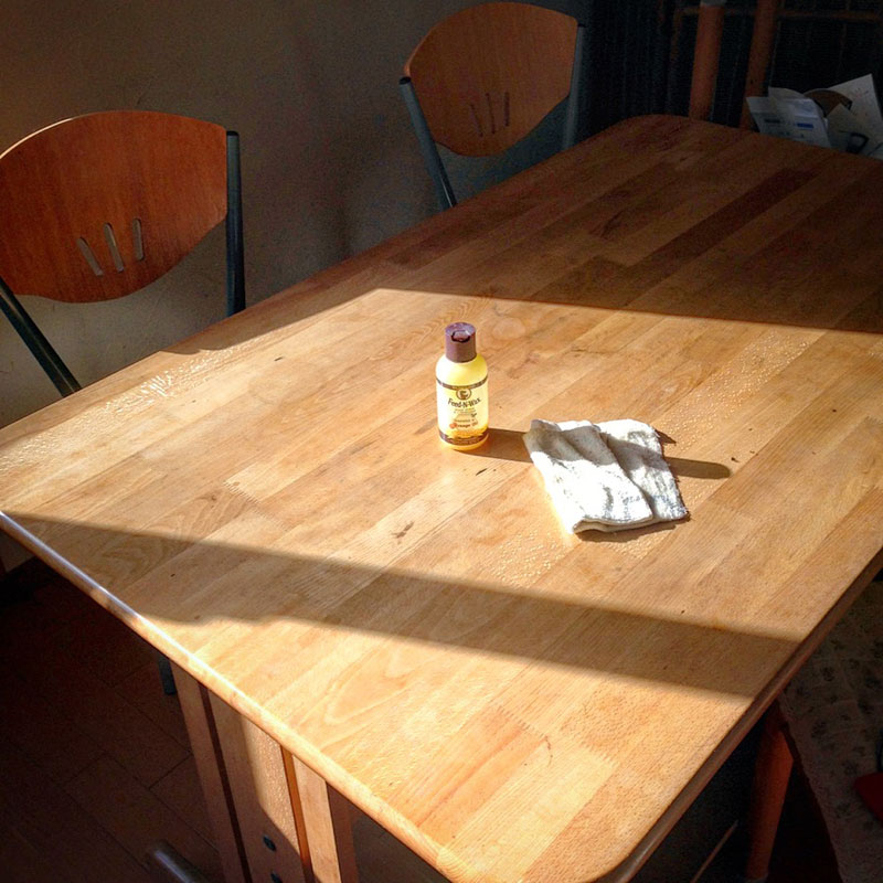 水が染みて跡が残る様になってきたので、蜜蝋塗りのメンテナンス。
