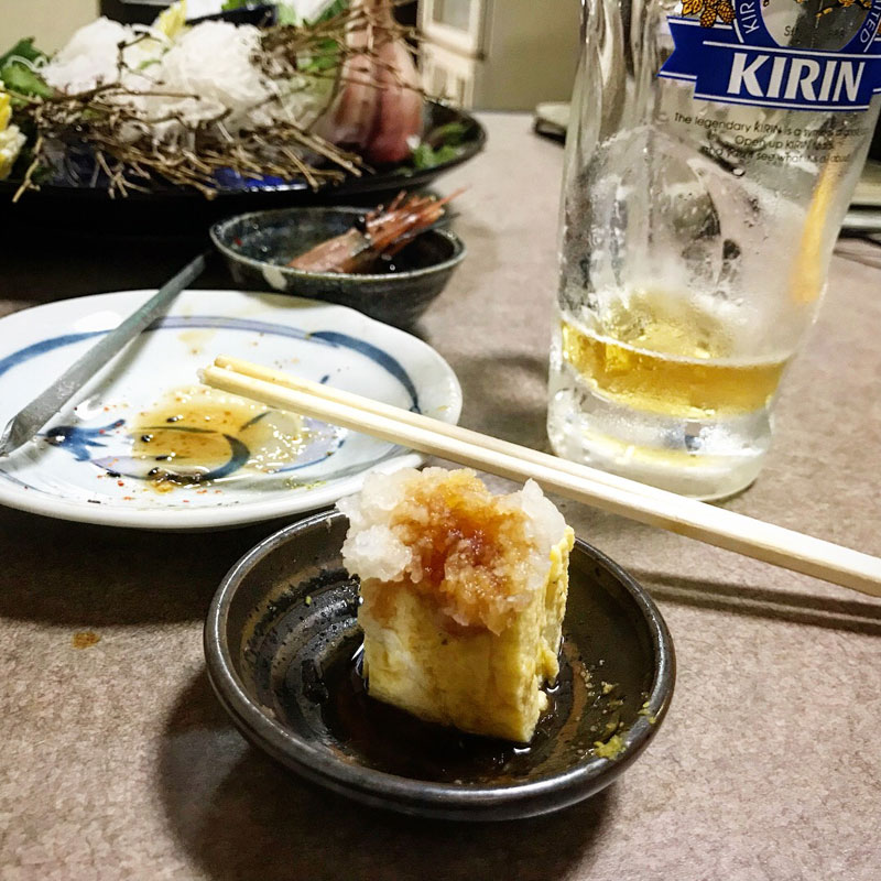居酒屋! 朝、畑の大根間引いて、取り急ぎ二品作った。 大根葉炒めじゃこ入り。 大根葉の塩もみ。ツナあえ。 地元のおいしい居酒屋でごちそうしていただいた!! 刺し盛りに焼き鳥、乾坤一。 十四代に生ビール。至福。 〆は大根おろしを乗せて卵焼き。ごちそうさまでした! 視界5mもあるかないかの、ものすごい濃霧の中、帰宅。 2017年10月14日 | コメントはまだありません | カテゴリー: おいしい