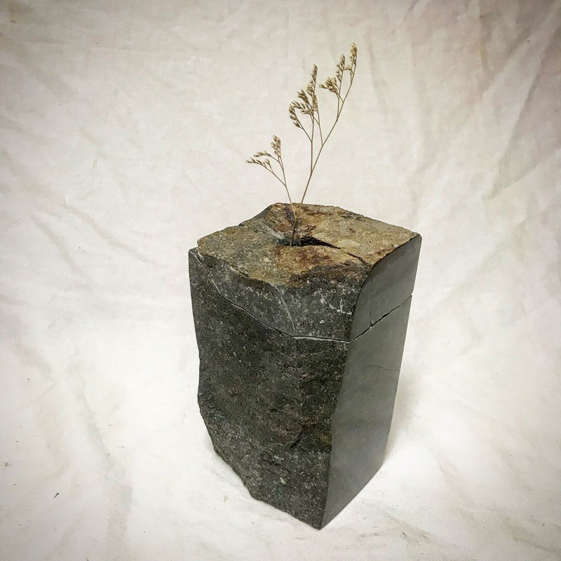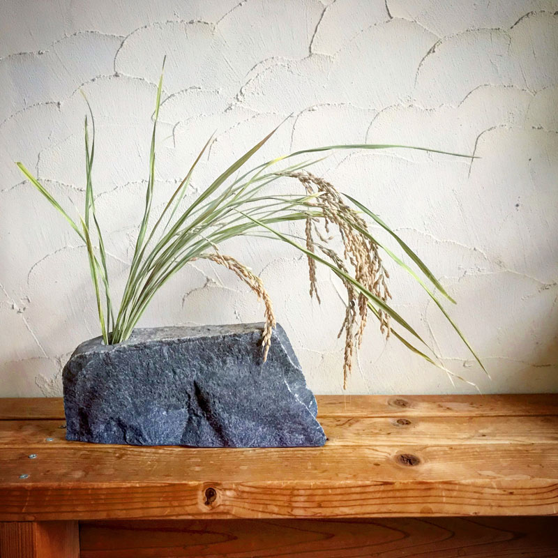 九州の浦田石材店の社長にいただいた天草木目石で作ったこの作品は、自宅で一輪挿しとして使っていますが芳名帳のペン立てとして会場に並べようと思っています。