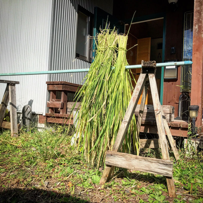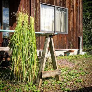 クルッと丸って玄関前で天日干し。だけどこれからどうしよう。脱穀、籾摺り、精米。お百姓さんのところに持っていったらあっという間に終了だけど、せっかくだから自分で何とかやってみようか、ネットでいろいろ調べてる。