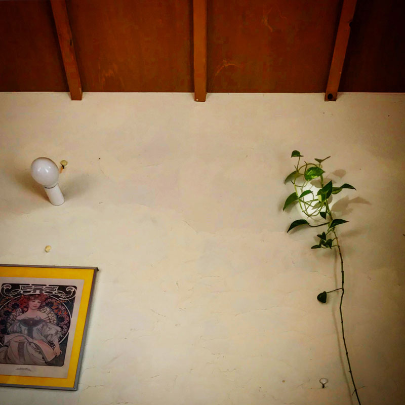 フォトスタンドに陽射しが反射して壁のポトスの先にだけ朝日が当たってる。