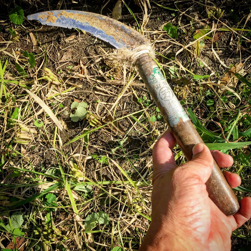 げんきまる、という品種。一畳くらいの作った田んぼの稲を借りてきた稲刈鎌で試し刈り。
