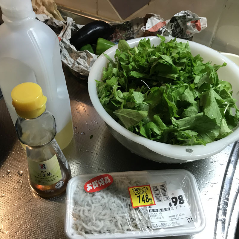夕食前に畑の大根を間引いて、また大根葉の炒め作った。