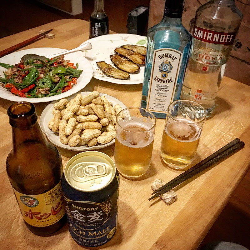 居酒屋我家、開店。外ホッピー一本だけ残して焼酎が無くなってしまったので、ウォッカ(SMIRNOFF)とジン(BOMBAI SAPPHIRE)を中(焼酎)の代わりにして飲み比べ。