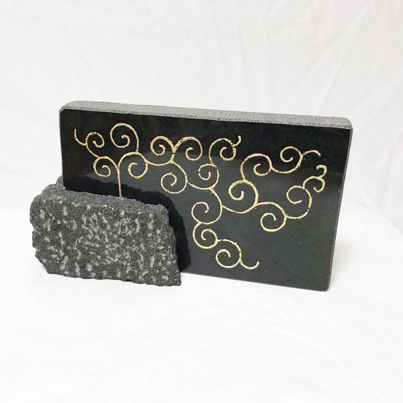 昨日、エントリーした人生で3つだけ出来た「割れ」の内の最後のひとつです。板状の部分と塊の部分は元はひとつの石だったので噛み合っています。夏に仕事場の覇権争いをしている葛の蔓を彫り込みました。