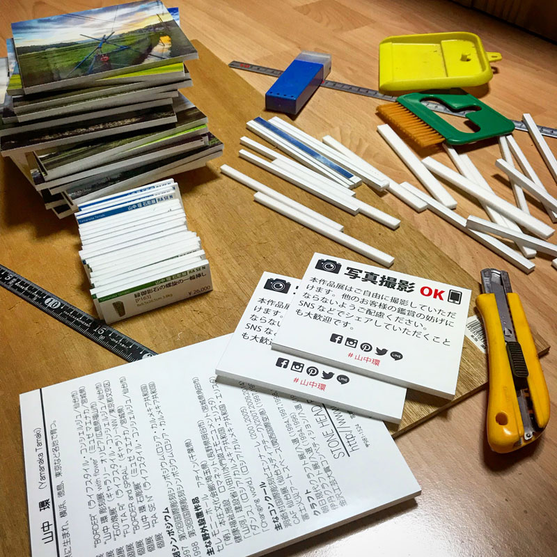 のリパネにプリントアウトしたフォトペーパーを貼って、カッターナイフで切りまくるのは個展の恒例行事になってますが。曲尺を押さえる左手の指が痛い。今回も石を彫っていた時に仕事場で見上げた空や、家からの行き帰りに見た空の写真も展示する予定です。