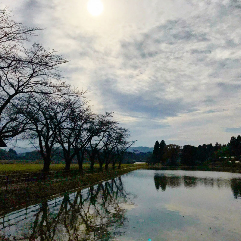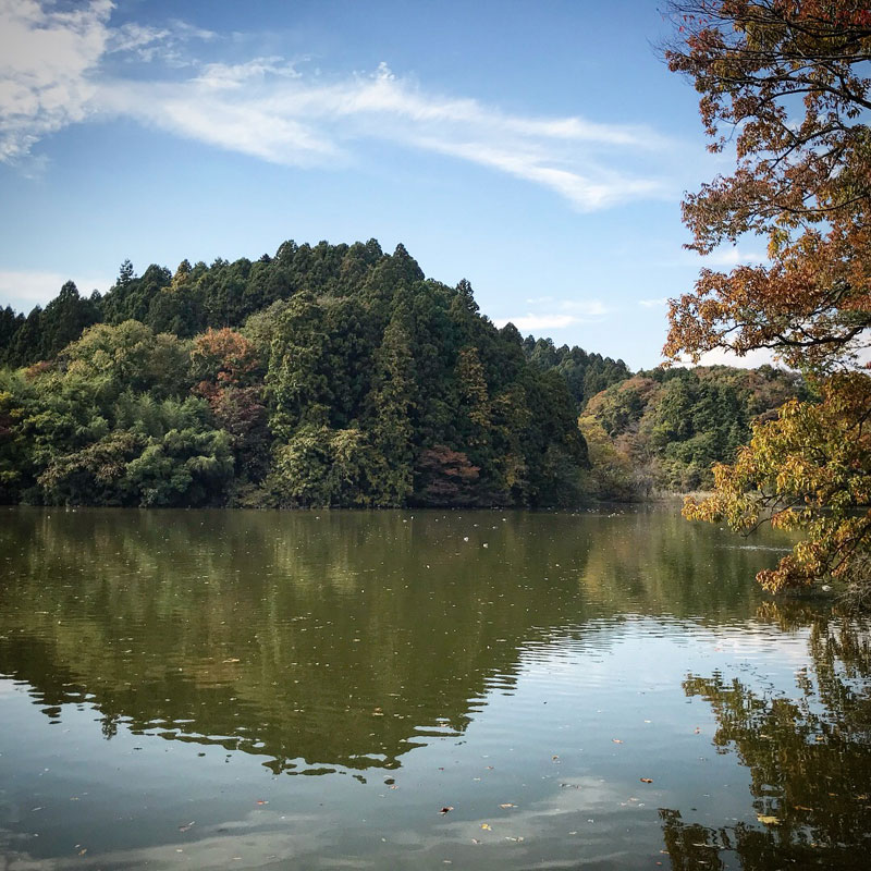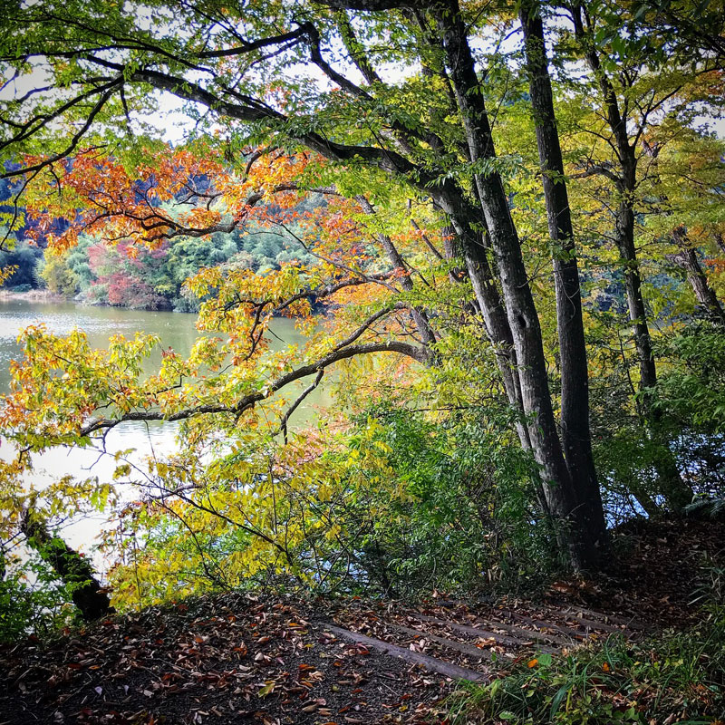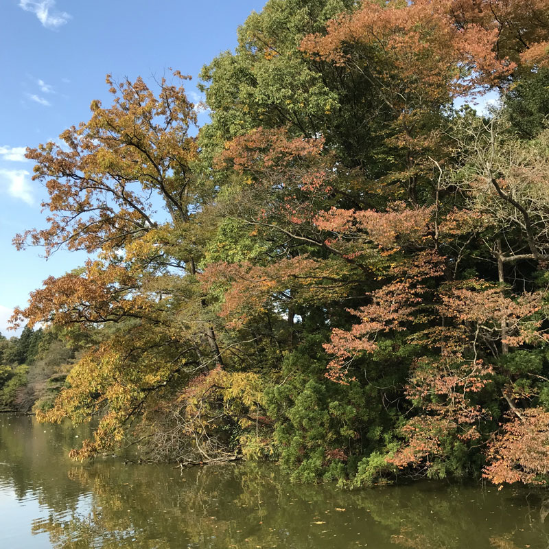 ラーメン食べに町に出た帰り、家のすぐ近くの手代木沼に寄り道して紅葉狩りして帰る。
