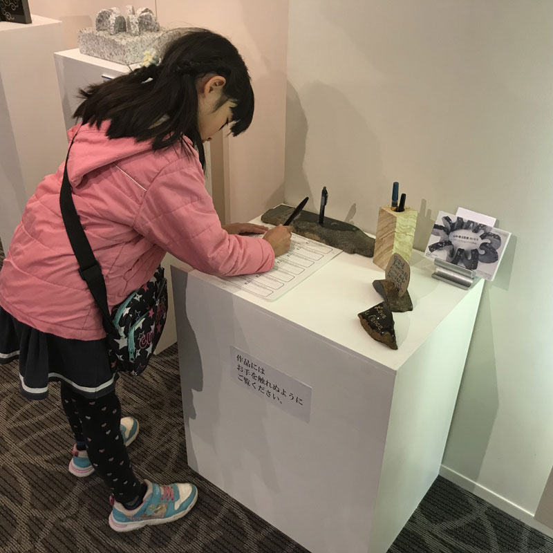 個展会場へ。今日も東京からも何人も個展を見に来てくれました。ありがたいことです。小梅ちゃんも記帳ありがとう!!