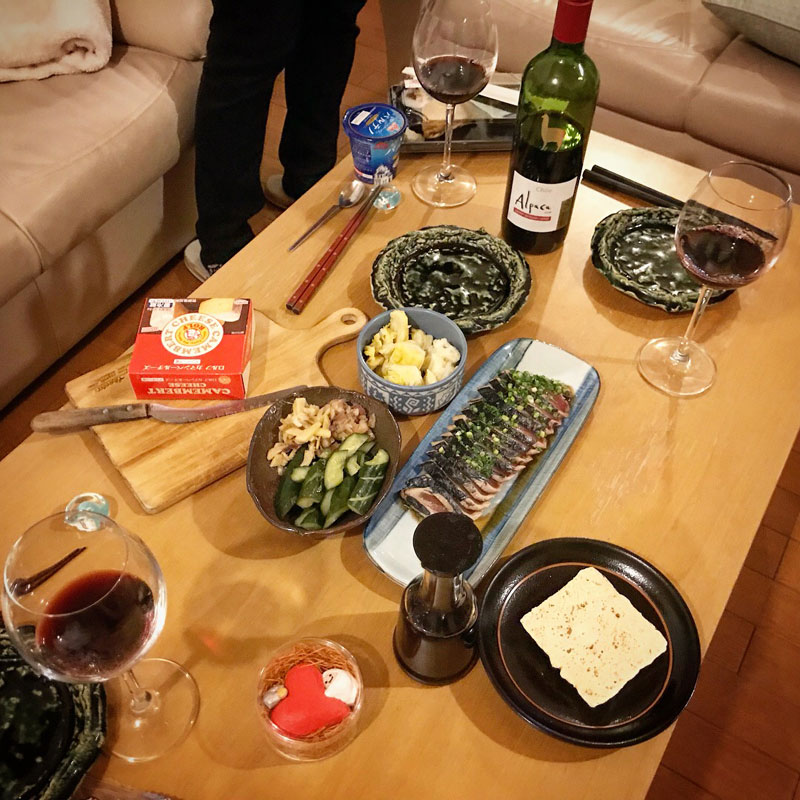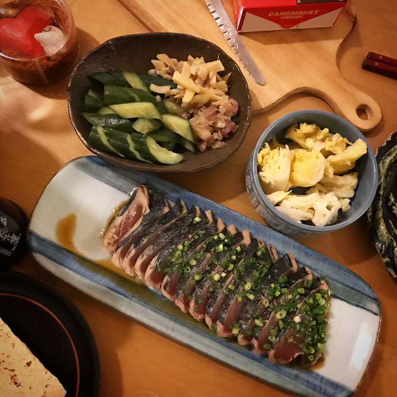 Maoさんのぬか漬け(こーゆーお土産が一番嬉しい!)と僕の漬けた白菜の共演。スーパーで超値下げしてたカツオのタタキ。