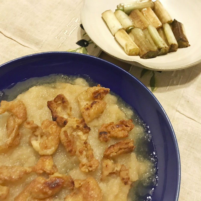 大根おろしとカリカリ鶏皮と鶏皮油で焼いた長ネギを一緒に食べたら至福。