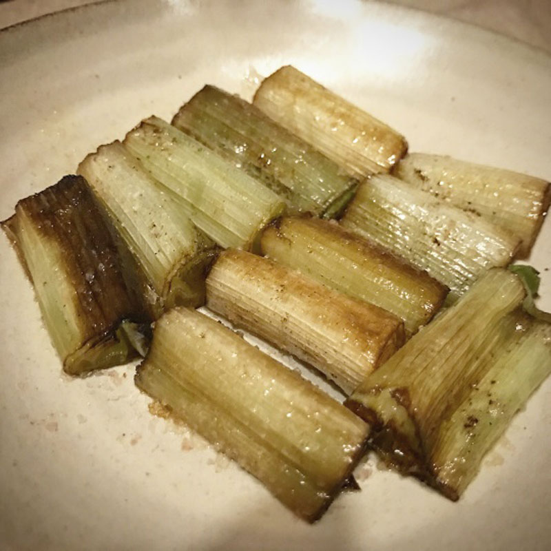 鶏皮をカリカリに焼く時にたっぷり出た鶏皮の油で煮るように焼いた長ネギ。
