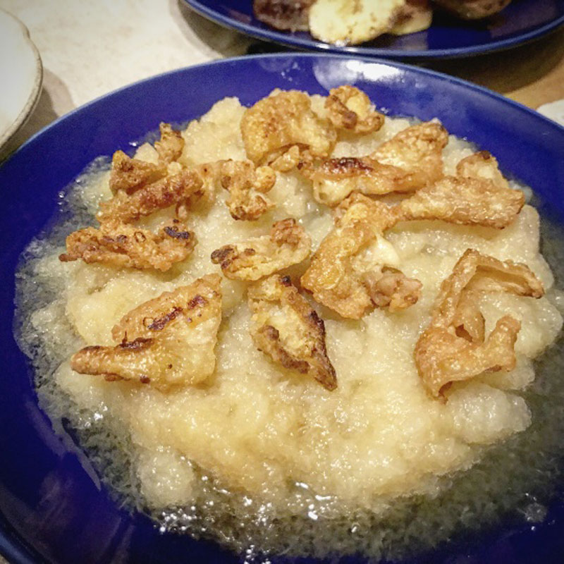 カリカリ鶏皮 on the みずみずしい大根おろし with ポン酢