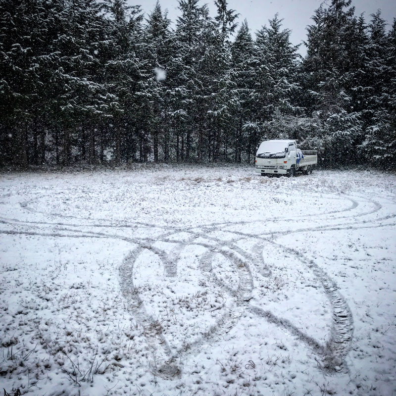 雪の日の楽しみのひとつ。仕事場に入るときに車でハートを描いたよ。