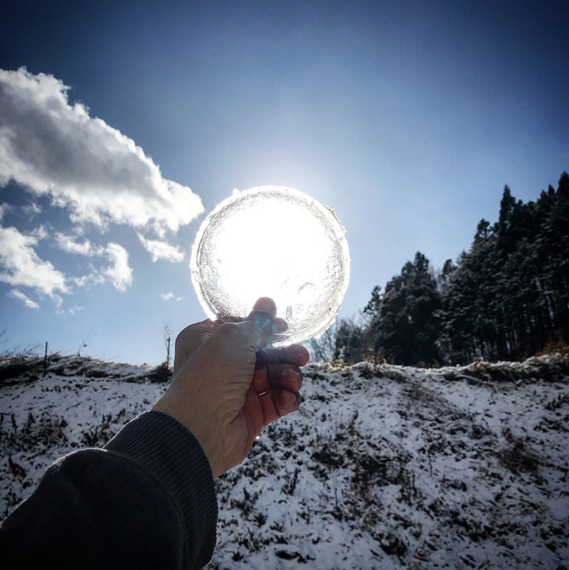 コンプレッサーに空気が溜まるまでの間氷で遊ぶ。冷たくて手の感覚が無くなる。