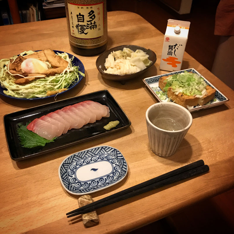 吹雪の中で泣きそうになりながら働いた日。仕事でカミさんは一足先に帰省して、ひとり居酒屋我家開店。多摩自慢をぬる燗で。安かった九州のかんぱちの刺身、カミさんが土鍋で煮ていってくれた鶏肉に温泉卵を添えて。厚揚げの外をカリカリに焼いてねぎと。自家製白菜の漬物。