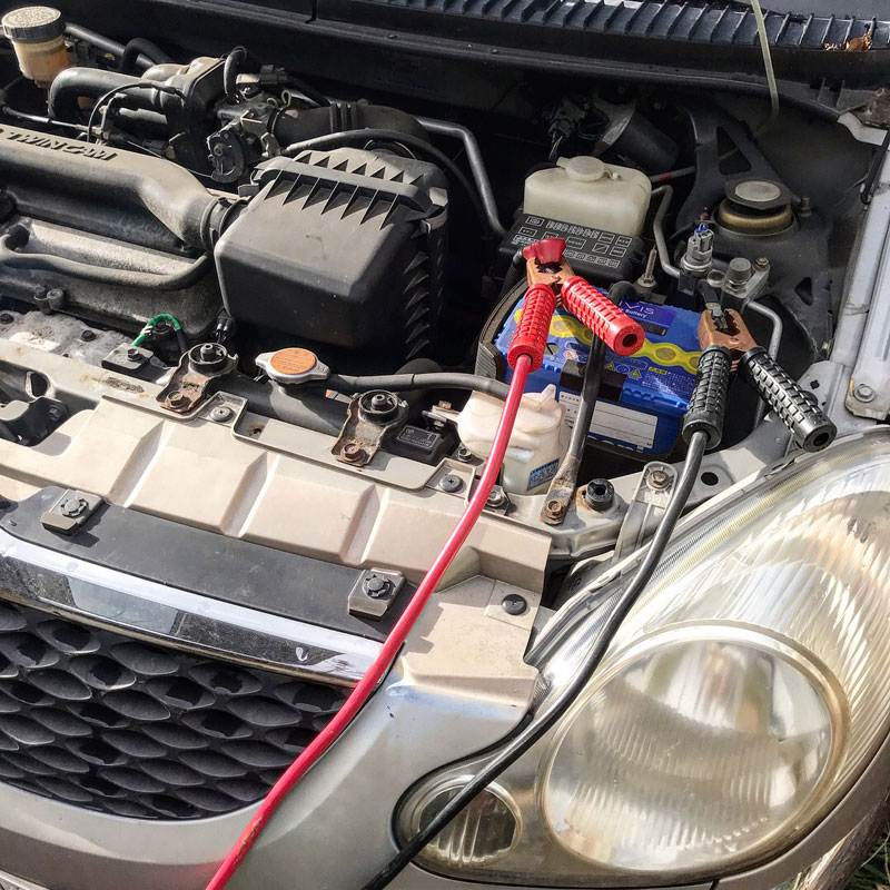 カミさんの車、バッテリーあがり。ブースターケーブルに繋いだ僕の車もやっとエンジンかかる。