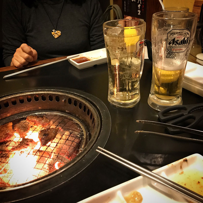 個展の打ち上げ。半年も経ってしまったけどやっと時間がとれたので、カミさんに運転してもらって隣町で焼き肉とビール。