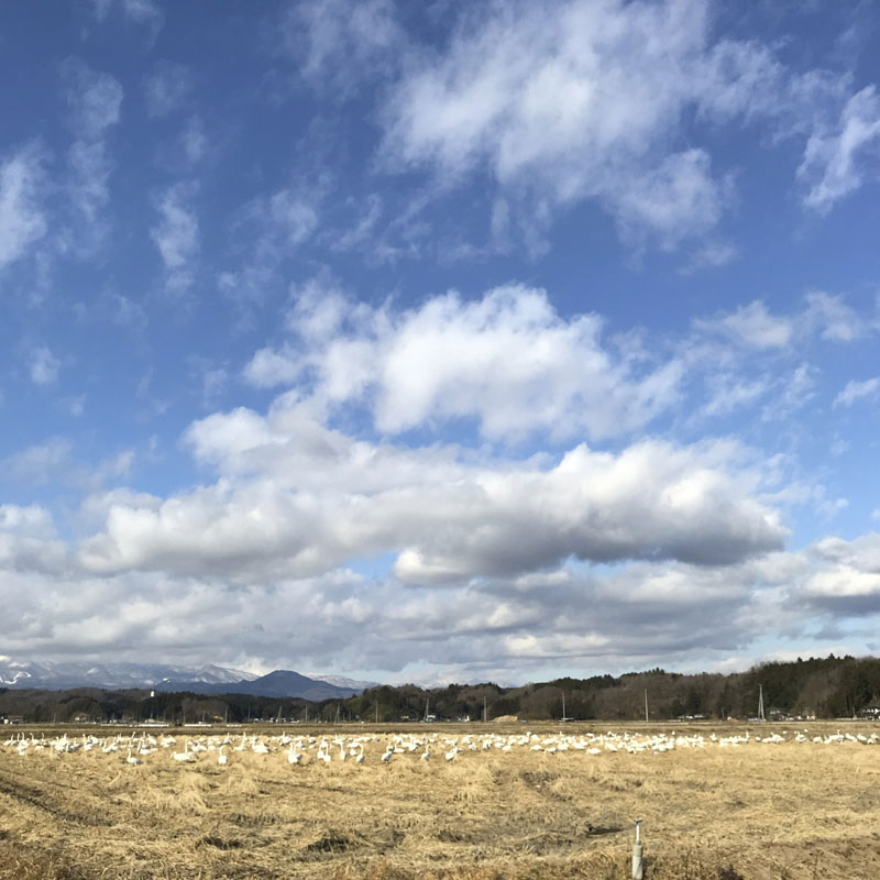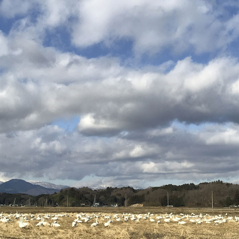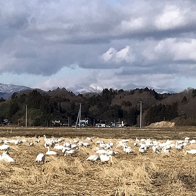 大雨で水が上がり、稲刈りが難しかったみたいで米がいっぱい残っている。白鳥たちはそれを食べている。