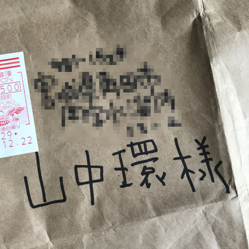 クラフト紙で包まれたキュービックな形も宛名の字もツボ!前にいただいた包み紙も切り取って部屋に貼ってあるよ・笑