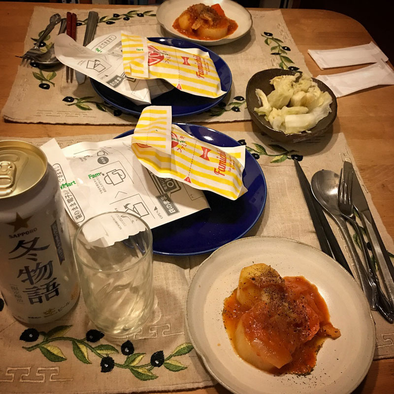 クリスマスイブ。午前中で石彫り仕事を終えて午後、部落の役員らで公民館と神社のすす払い。そして懇親会の後、家に帰ったらカミさんがファミチキ買ってたので乾杯。