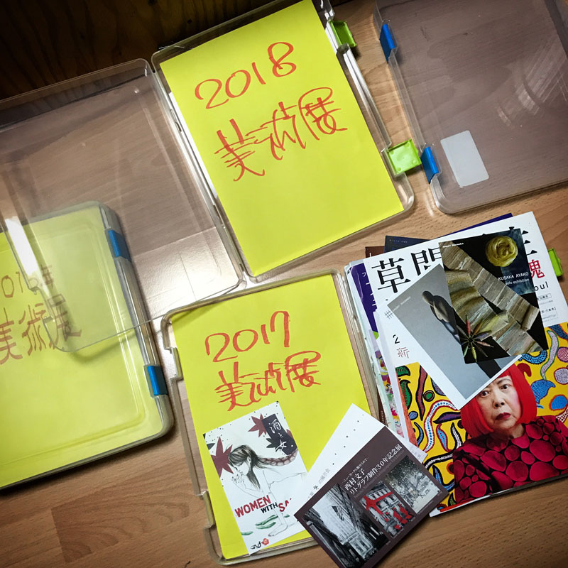 100円ショップの4cmの厚いA4クリアケースに、見に行った展覧会のチラシやDM、半券などを入れていくと、ちょうど1年分で満タンになるのだ。今年もたくさん見られるといいなぁ。作るのと同じくらい好き、作品見るの。