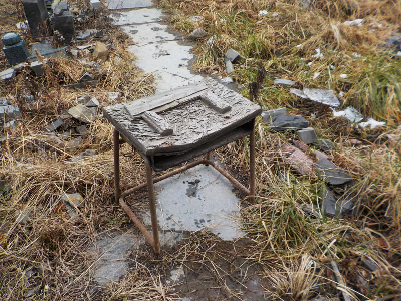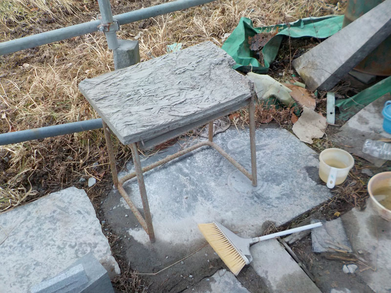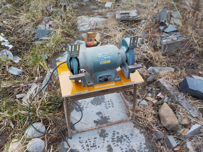ノミの刃を削る卓上電動グラインダを乗せる台。屋外だから何年も使って木がボロボロ。